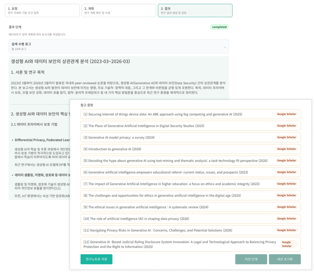 - 확정된 연구 계획에 따라 AI가 상세 보고서를 작성합니다.