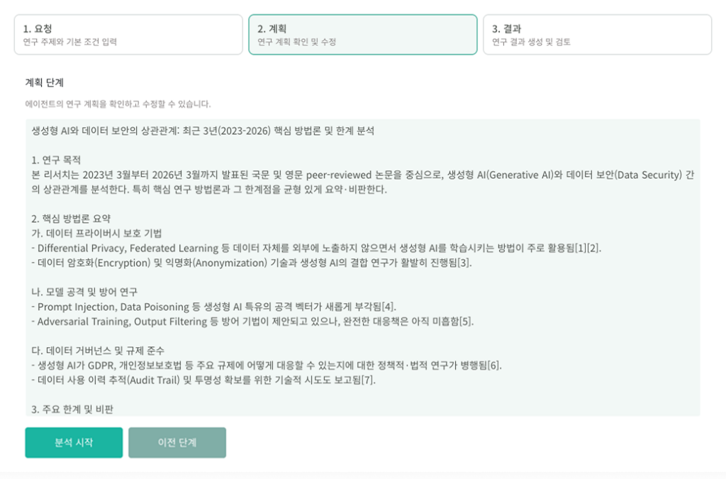 - 사용자는 AI가 세운 계획을 검토하고, 필요에 따라 내용을 직접 수정하거나 보완하여 연구 계획을 확정할 수 있습니다.