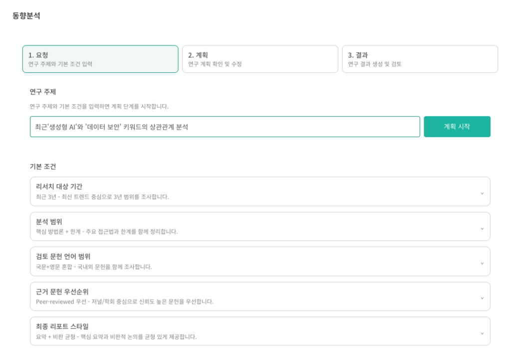 - 동향 분석은 주제 및 조건 입력>계획 수립>결과 작성 3단계로 진행됩니다.